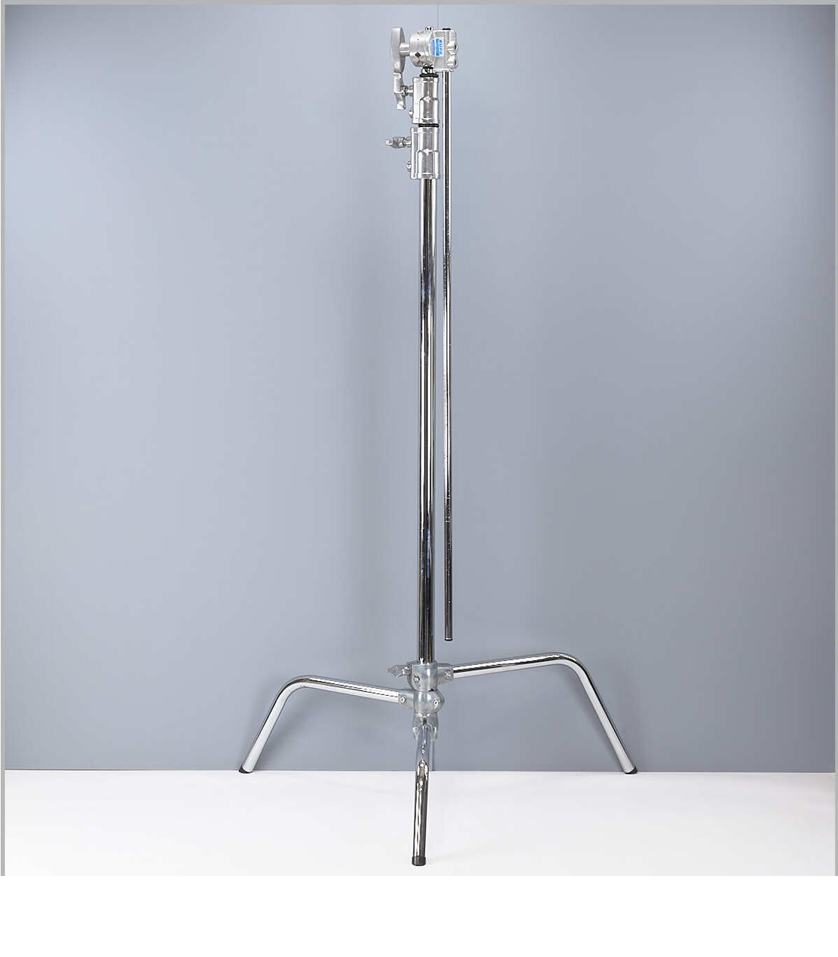 The Kupo master C-stand has two fixed spring-loaded legs and a third leg adjustable via a locking knob for leveling on uneven terrain. Ideal for outdoor, studio, and LED virtual production.