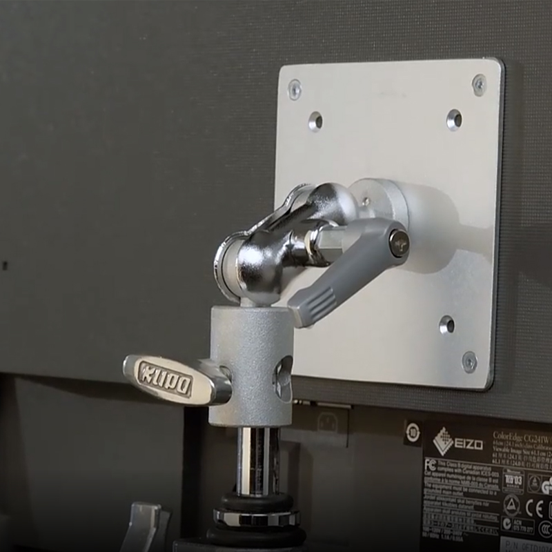 The Kupo Monitor Adapter is designed for lightweight monitors. Its flat plate has 2 sets of 4 mounting holes at the corners spaced 3 and 4" respectively apart from each other.