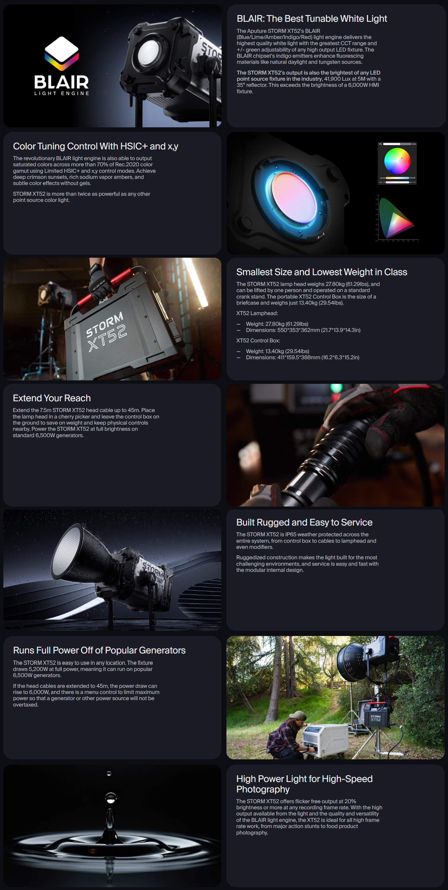 The STORM XT52's output is also the brightest of any LED point source fixture in the industry, 41,900 Lux at 5M with a 35° reflector. This exceeds the brightness of a 6,000W HMI fixture.